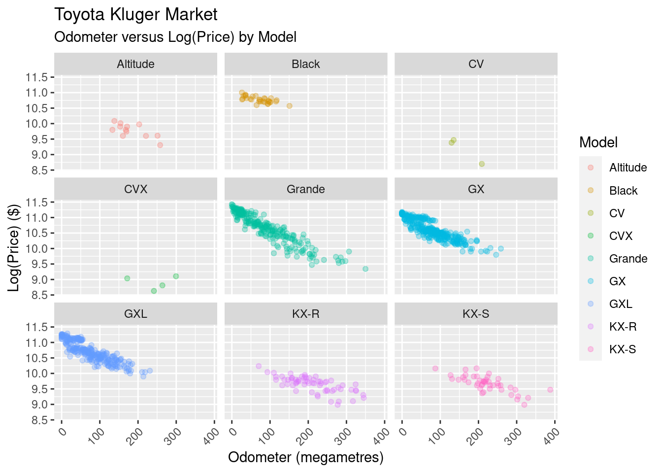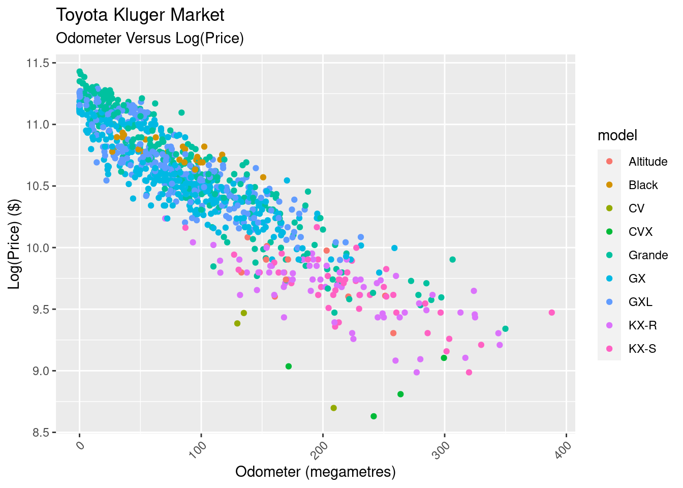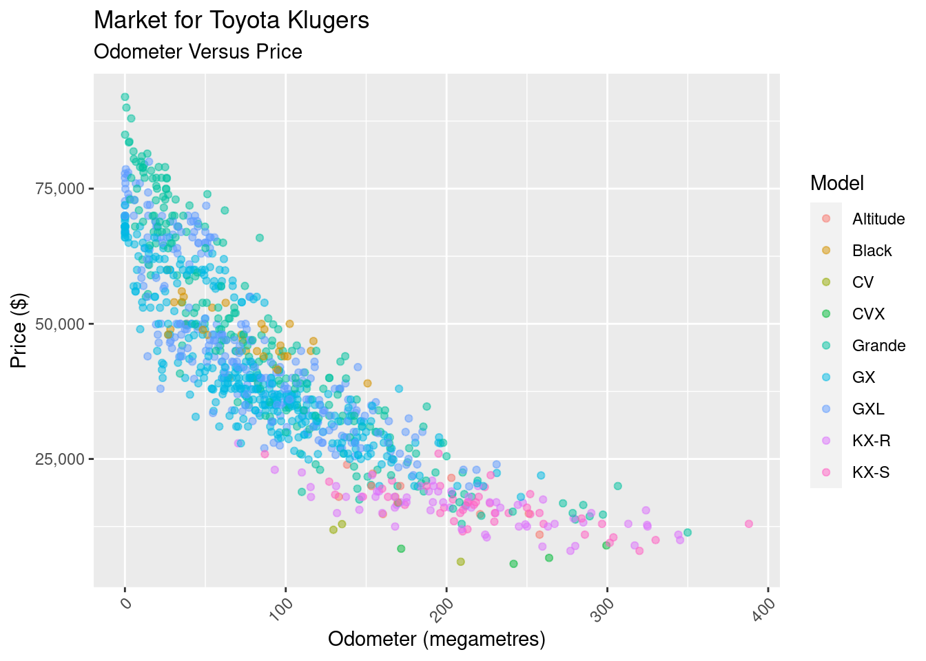 A word of warning before anyone gets too invested: this article is slightly anticlimactic. We do find that the sale price of a Kluger will reduce by around .6% for every 1,000 km driven, but there’s still a lot of variability that we dont capture, making our prediction intervals too wide to be of any use. There’s a other factors that go into determining a price that we need to take into account in our model.