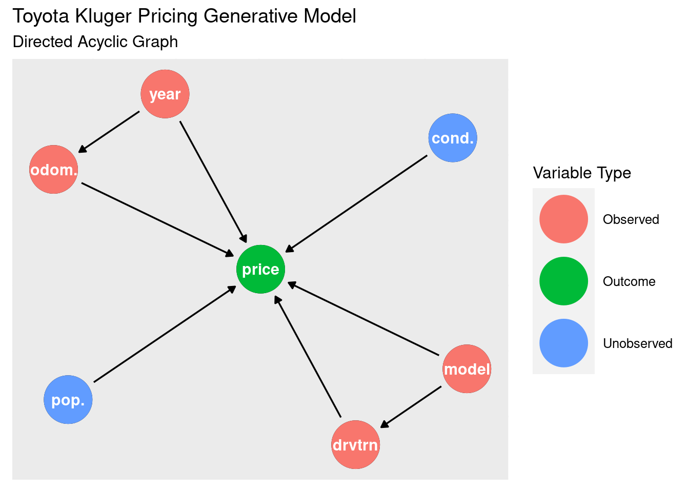 Let’s start the modelling by thinking about the generative process for the price. Our observed variables odometer, year, model, and drivetrain are likely going to have an affect on price. There are some unobserved variables, such as the condition of the car its popularity that would also have an affect. There’s some confounds that may need to be dealt with as well: year directly affects price, but also goes through the odometer (older cards are more likely to have more kilometres). Model affects price, but also goes through the drivetrain (certain models have certain drivetrains).