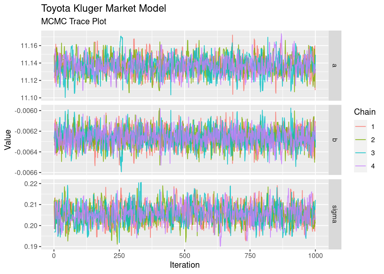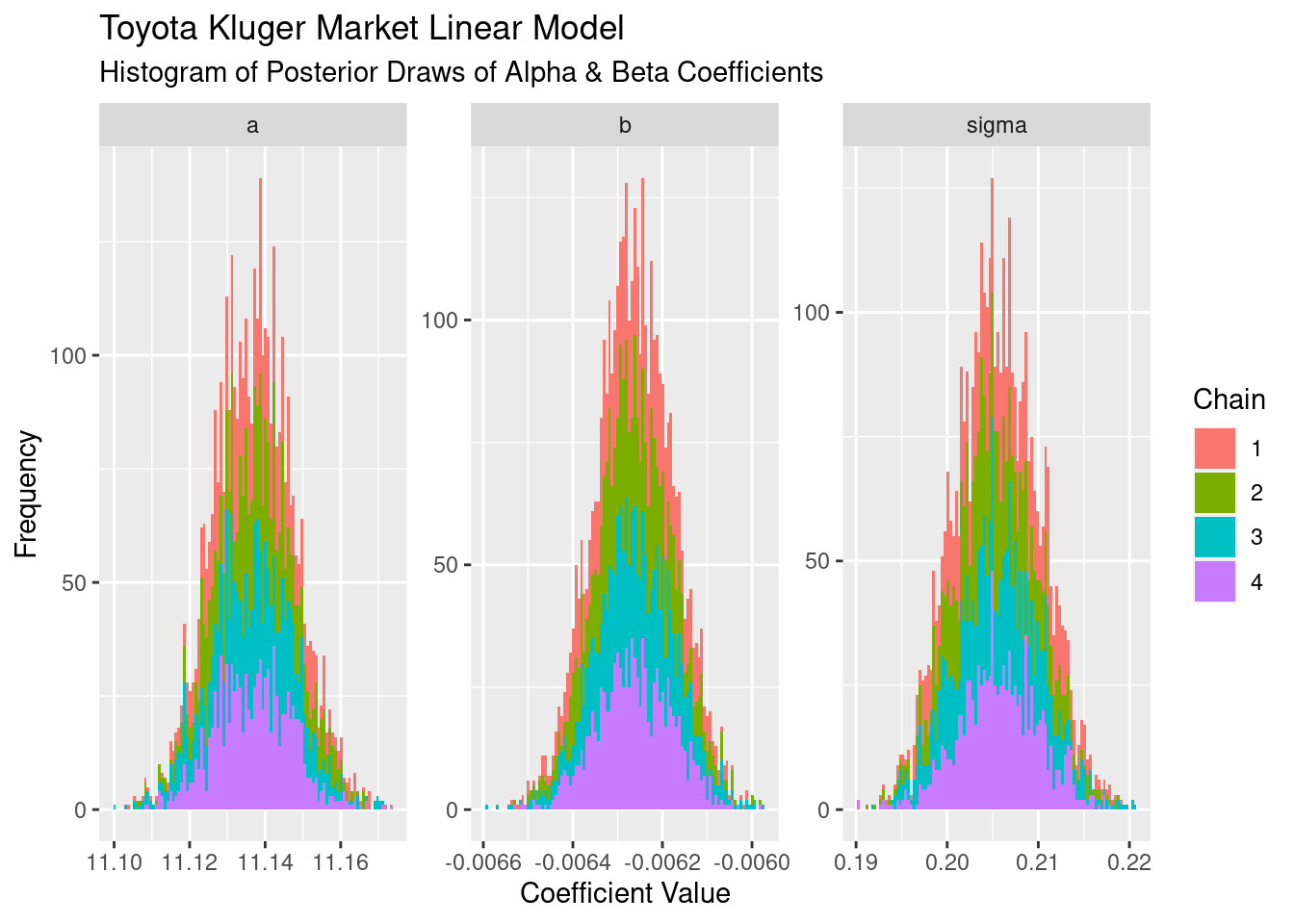 The first thing to notice it that, on the whole, each one looks Gaussian. Secondly, each of the chains has a similar shape, meaning they’ve all explored similar parts of the posterior. The intercept a has a mean approximately 11.13, and the slope b has a mean of approximately -0.0063. These are on a log scale, so exponentiating each of these values tells us that the average price with zero on tne odometer is ~$66k, and for every 1,000km the average price is ~99.3% what it was before the 1,000km were driven.