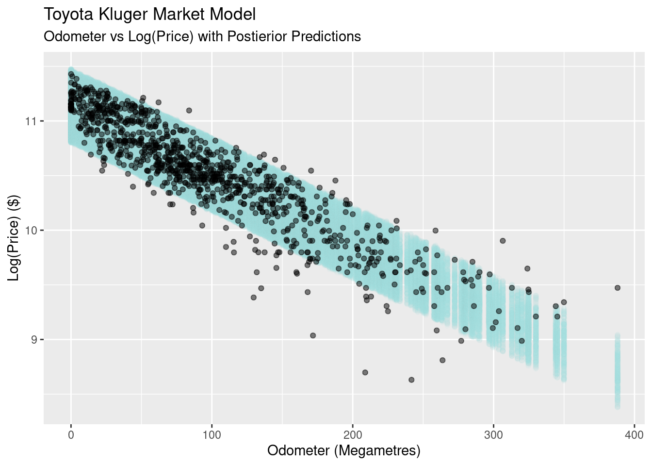 While I do have these variables available to me, I’d like to start with the most simple model I can: log of the price predicted by the odometer (in megametres). In doing this I’m leaving a lot of variability on the table, so the model’s ability to predict is likely going to be hampered. But better to start simple and build up.