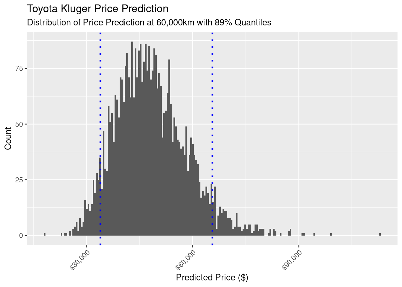 Despite these obvious flaws, let’s see how the model performs answering our original question: “what is the market sell price for a Toyota Kluger with 60,000kms on the odometer?” I’m using this line from the generated values section of the Stan model: