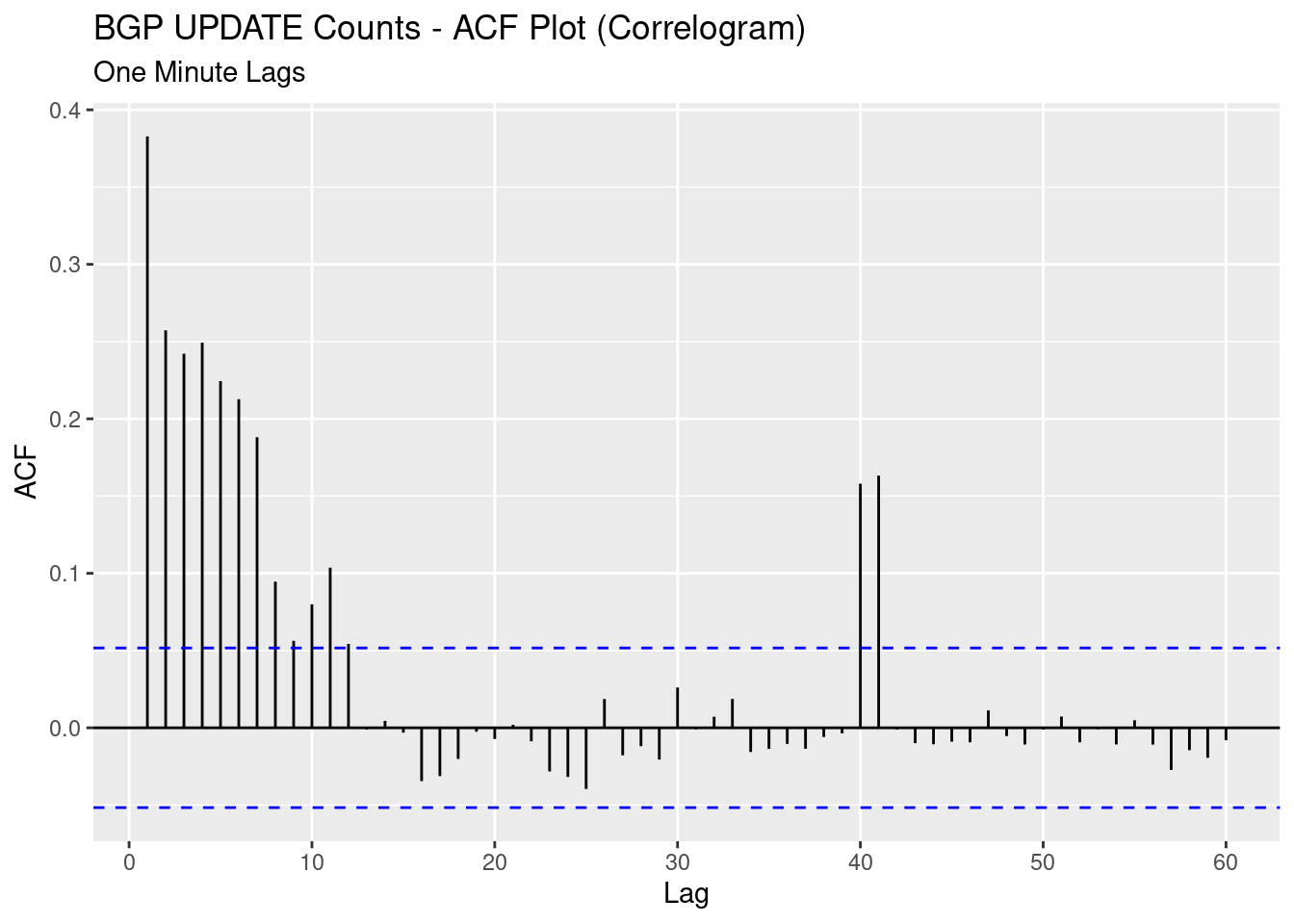 What is apparent in both the path and IP space changes over time is that there is some sort of cyclic behaviour in the IPv4 updates. To determine the period of this cycle we can use an ACF or autocorrelation plot. We calculate the correlation between the number of paths received at time \(y_t\) versus the number received at \(y_{t-{1,t-2,…,t-n}}\) lags. I’ve grouped the updates together into 1 minute intervals, so 1 lag = 1 minute.