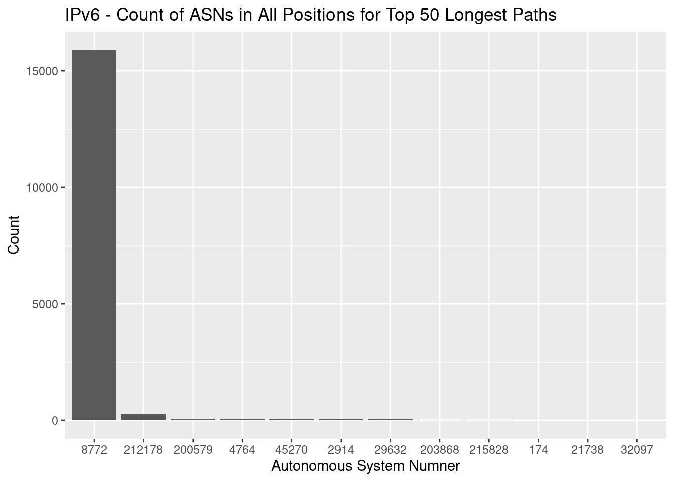 Why is there such a difference between the largest IPv4 and IPv6 path lengths? I had a couple of different theories, but then looked at the total number of ASNs in all positions for those top 50 longest paths, and it became apparent what was happening: