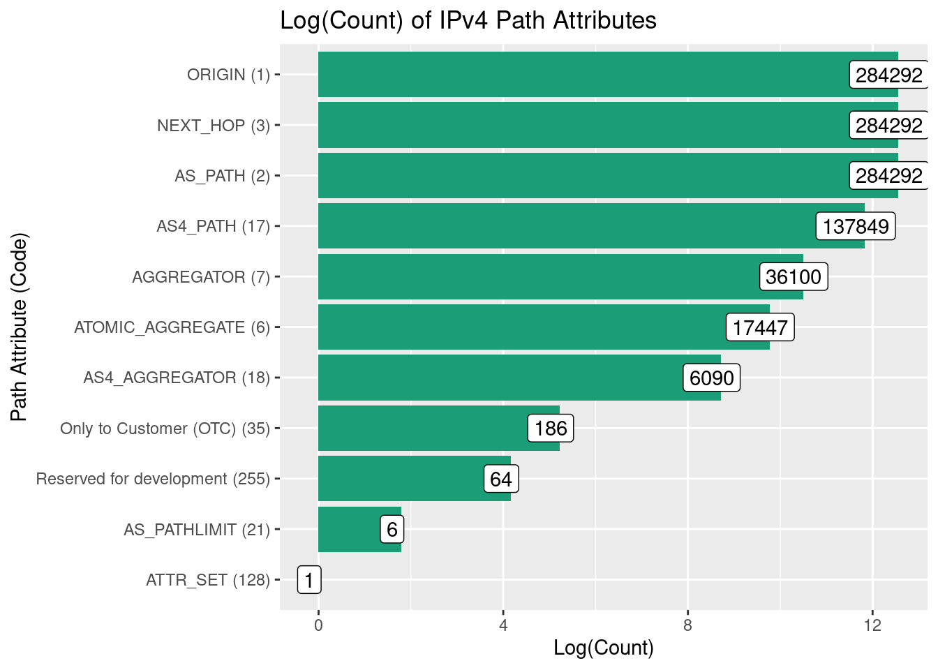 The well-known mandatory attributes, ORIGIN, NEXT_HOP, and AS_PATH, are present in all updates, and have the same counts. There’s a few other common attributes (e.g. AGGREGATOR), and some less common ones (AS_PATHLIMIT and ATTR_SET). However some ASes have attached attribute 255 - the reserved for development attribute - to their updates.