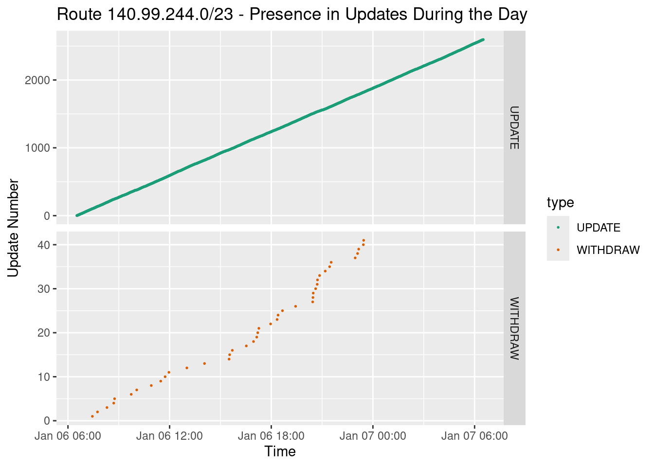 The top graph looks like a straight line, but that’s because this route is present in almost every single 30 second block of updates. There are 2,879 30-second blocks and it’s present as either a different path or a withdrawn route in 2,637 of them, or 92.8%!