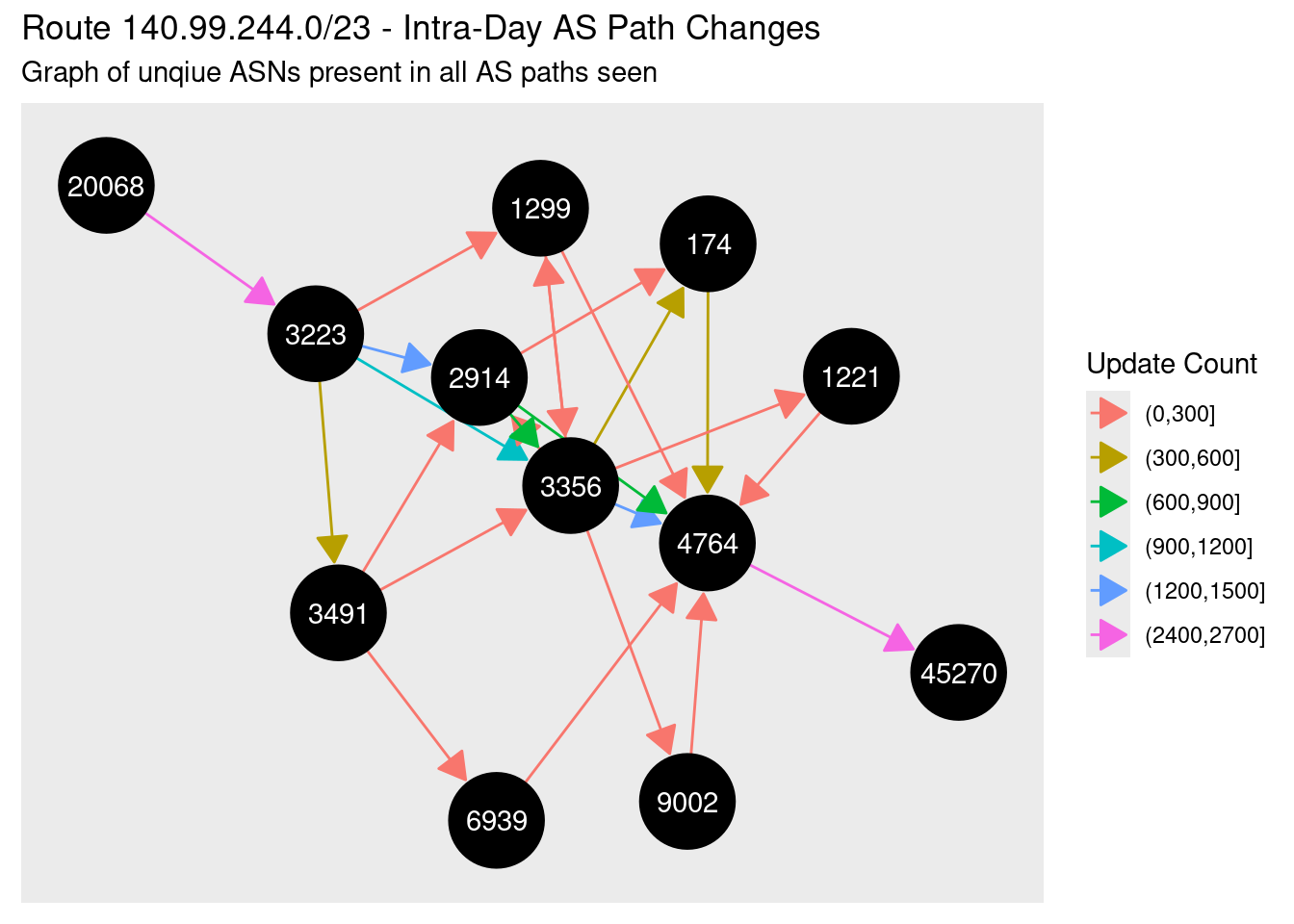 We know the routes is flapping, but how is it flapping, and who is to blame? The best way to visualise this is a graph, with the ASNs in all paths to that network as nodes and edges showing the pairs of ASNs in the paths. I’ve colourised the edges by how many updates were seen with each pair of ASes, binned into groups of 300: