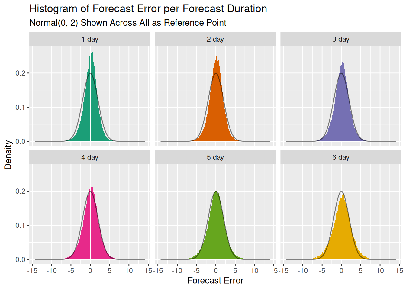 A histogram of the errors shows their distribution and how that changes over time. I’ve overlaid a normal distribution with a fixed mean of 0 and standard deviation of 2 to act as a reference point: