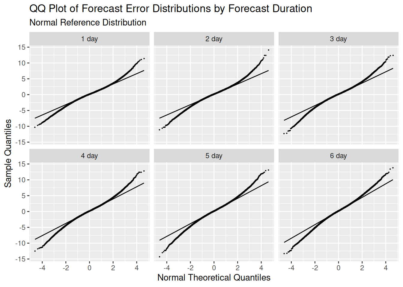 This shows that these the forecast error distriubtions, like we mentioned before, track the normal for the first two standard deviation. Outside of that they have fatter tails than a normal, i.e. you’ll find more observations inside 3 or 4 standard deviations than you would in a normal distribution.
