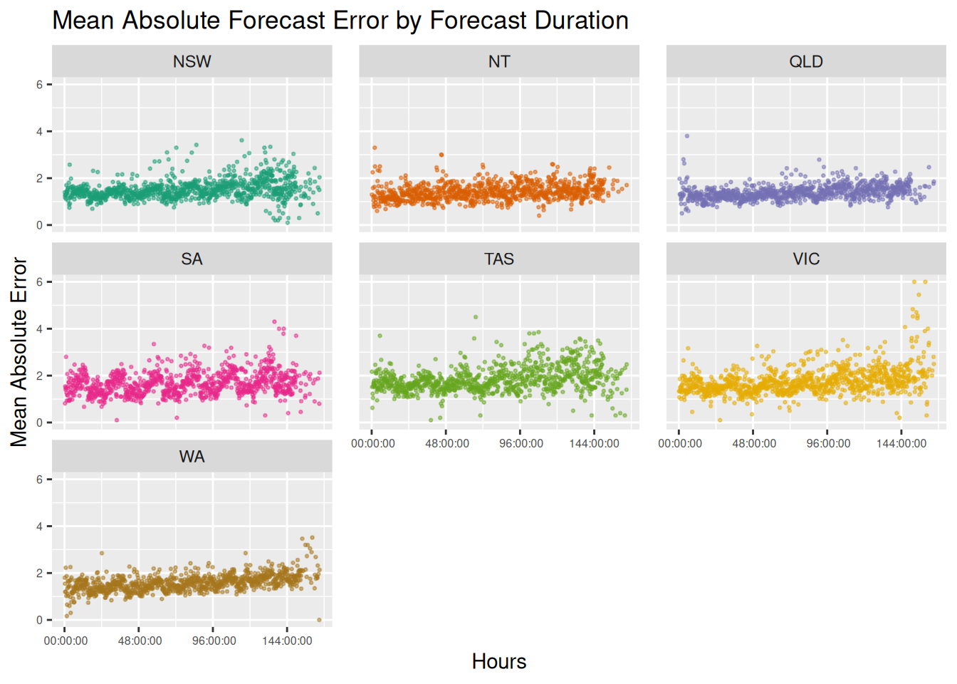 There’s two things that immediately jump out at me: the is first is both the variance and mean absolute error over time appear to be much greater for Victoria, Tasmania, and South Australia as opposed to the others. The second is that there appears to be a cyclical nature to the forecast error. Setting aside what I’ll call the ‘southern state’ issue, we’ll investigate the cyclical nature.