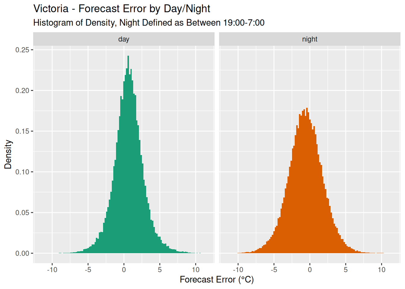 Let’s code the forecast’s time as either ‘night’ based on whether the time is after 7pm and before 7am, and ‘day’ for all others. This makes sense for the time period of the data. Interestingly if we look at a density plot of the forecast error we see a difference in variation between night and day.