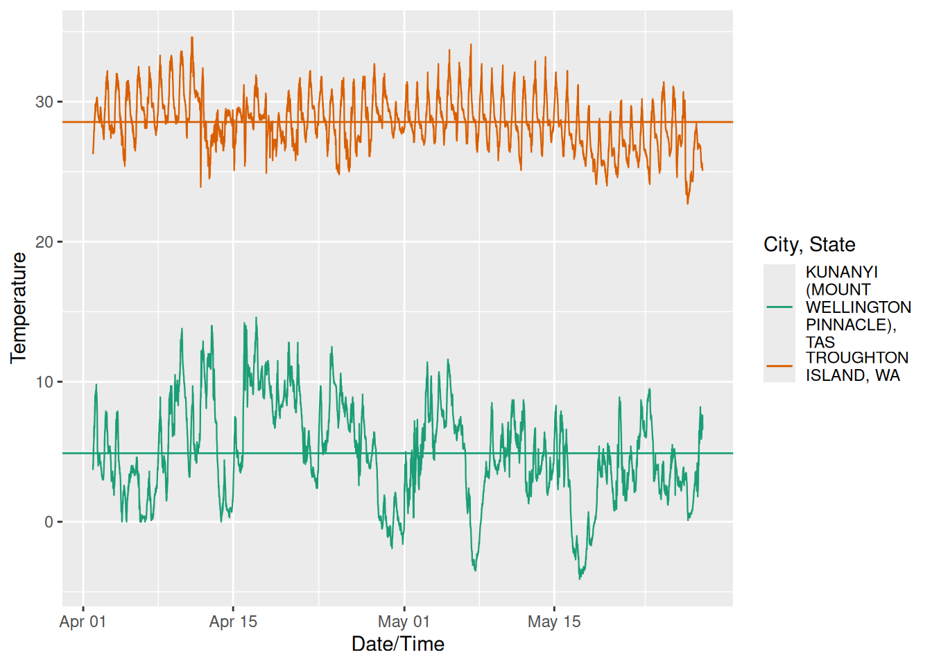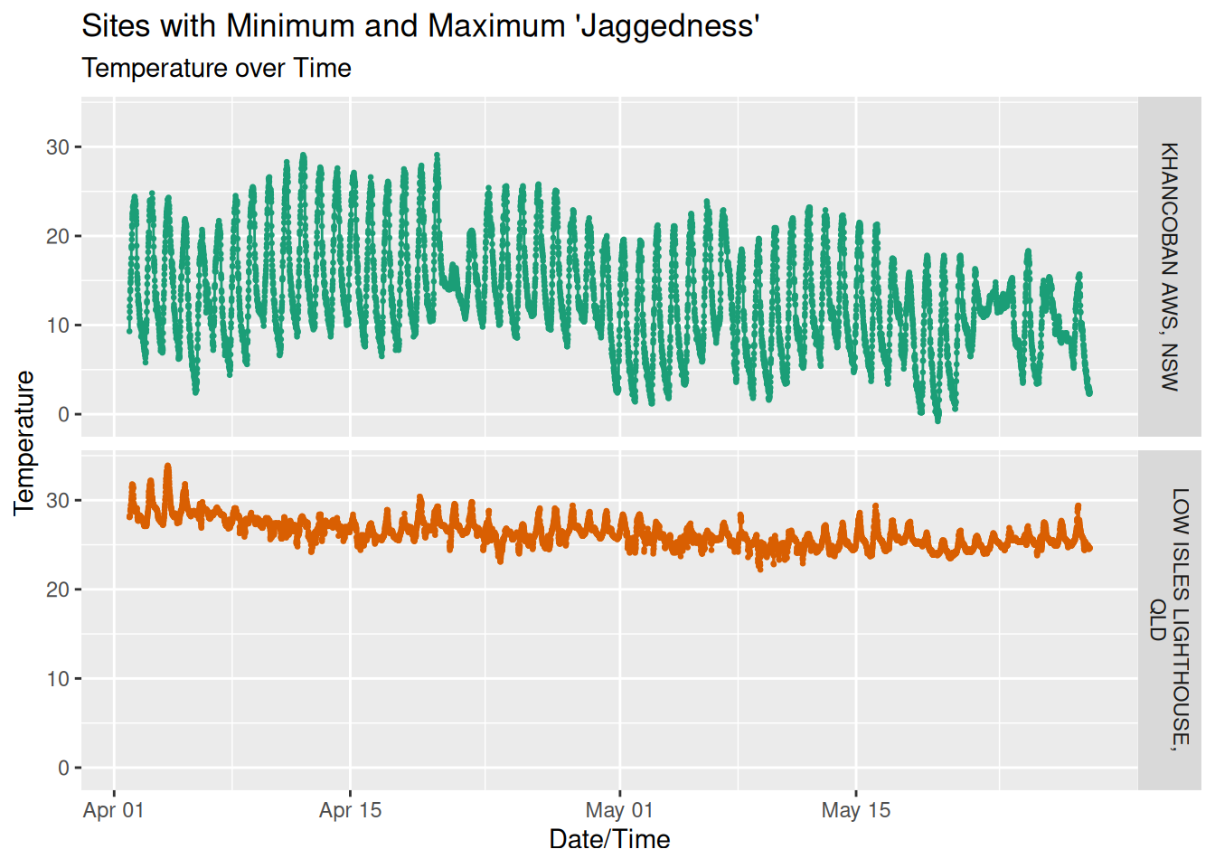To give this some perspective, here are the temperatures over time for the locations with the highest and lowest jaggedness indexes: