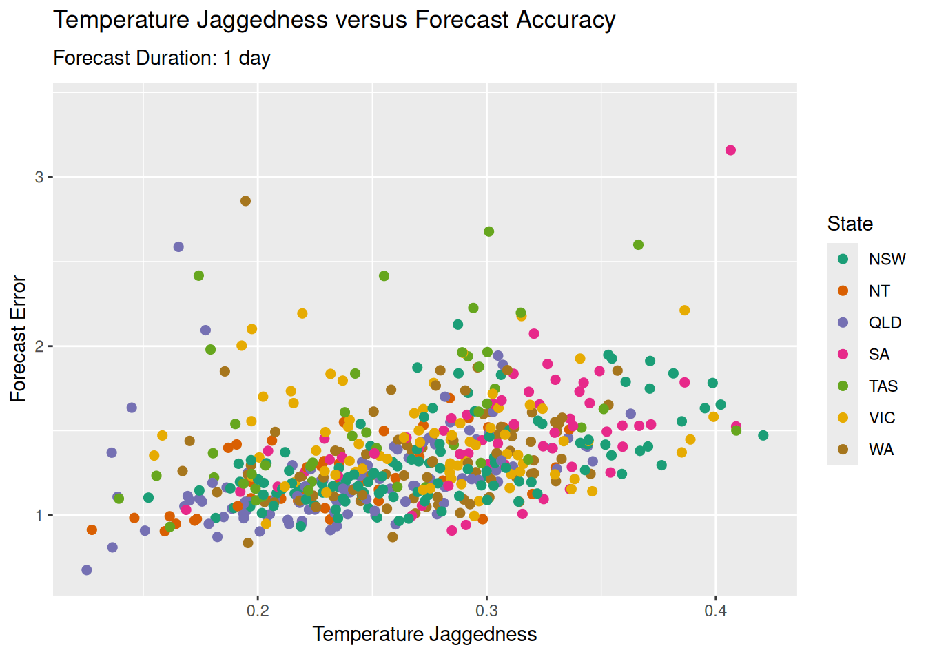 Phew, that one just kept going and going! A recap: we gathered 8 weeks of temperature and temperature forecasts from around Australia, and looked at how well the forecasts performed depending on how far out the forecast was. We then created a summary statistic - jaggedness - and attempted to create a linear model for predicting forecast accuracy based on this, as well as forecast duration. It did OK, but it’s probably a little simplistic, and perhaps not much use in the long term.