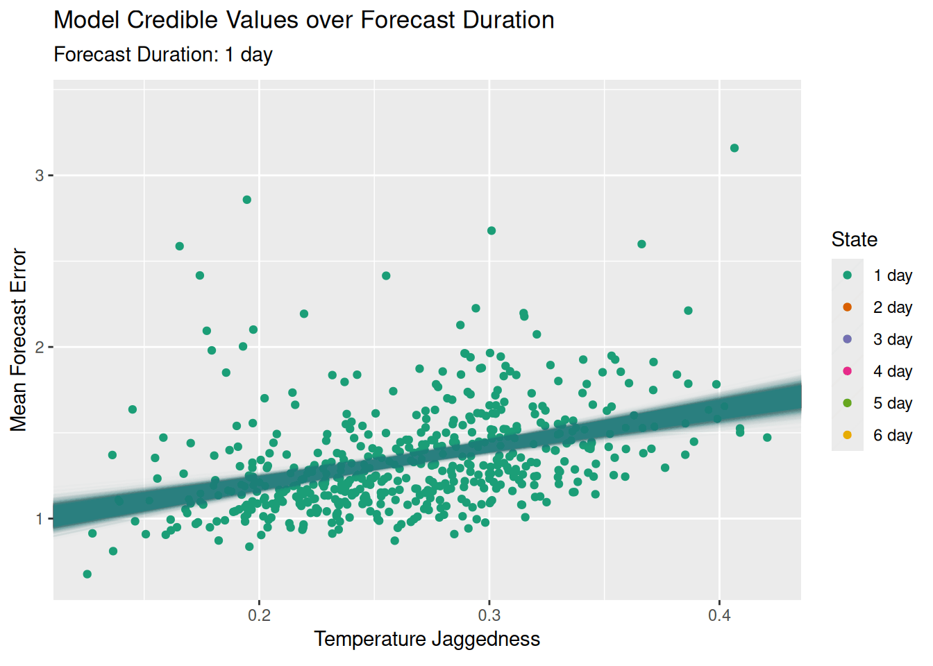 We’ll use Stan to create a simple linear model with two parameters: the jaggedness as a continuous variable, and the day-lagged forecast duration as a categorical index. Here’s the full specification of the model: