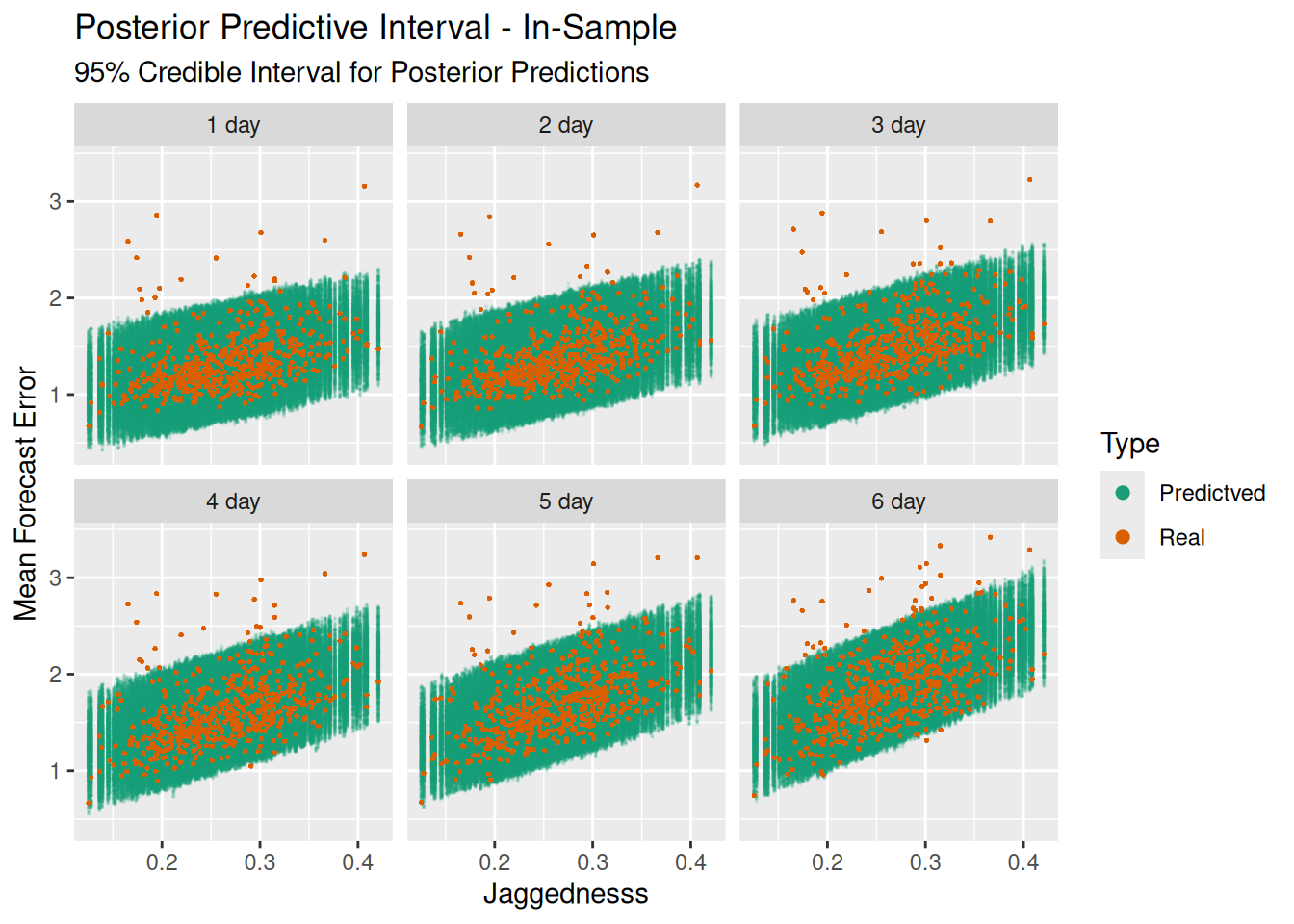 - beta_jaggedness[6] - for each increase of jaggedness by 1, you would expect on average the mean forecast error to go up by 4 degrees, with a 95% credible interval of between 3.56 and 4.46.