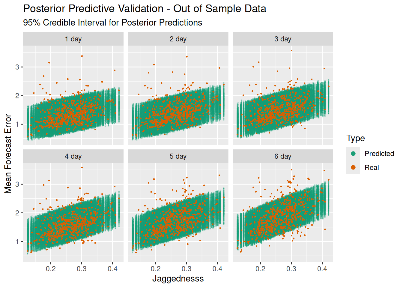 The real test of the model is how it performs on out of sample data. I’ve held out ~3 weeks of temperature/forecast accuracy data from the time period immediately after the training set. Each location is still using the jaggedness calculated from the training temperatures. Let’s take a look at how it performs: