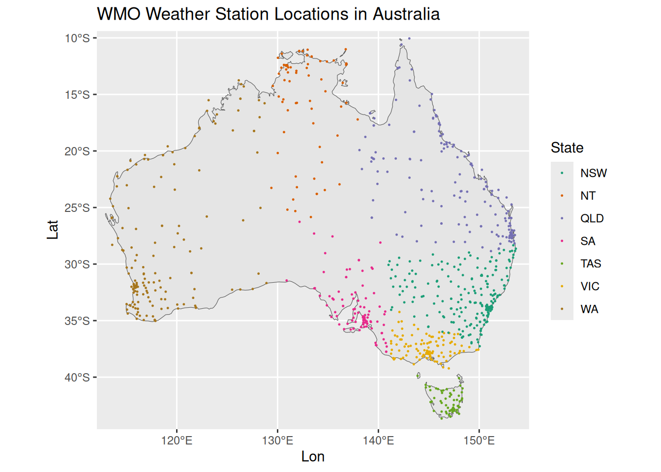 Number one was easy, as the BOM provides a list of weather stattions, including their name, latitude, longitude. This list get’s filtered down from ~6,500 total active weather stations to 526 that have a world meteorological organisation (WMO) ID. Here’s their locations around Australia: