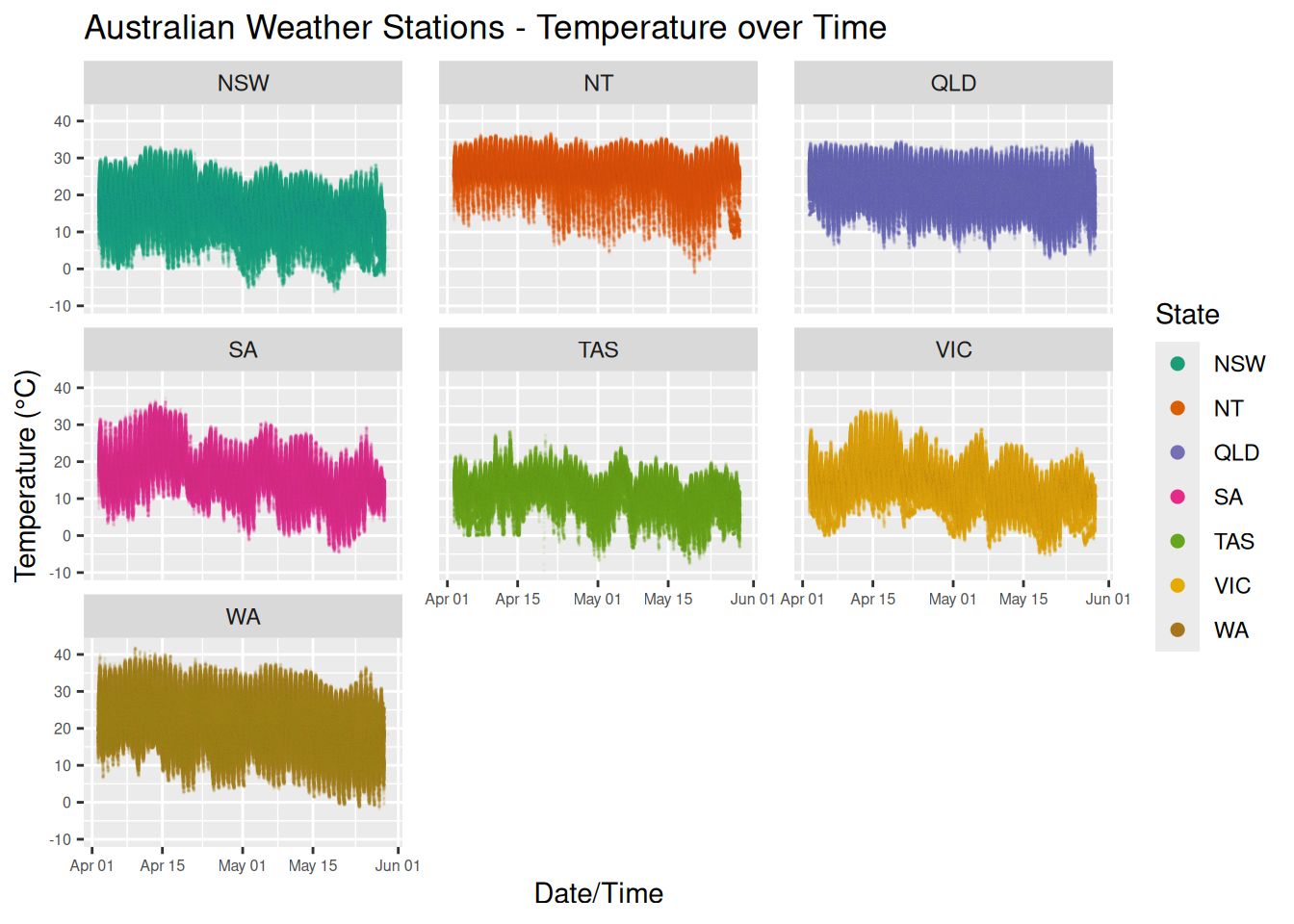 The BOM provides a 3-hourly temperature forecasts for each location (e.g. 1:00AM, 4:00AM, … 10:00PM) out to 7 days. As with the temperature, I’ve acquired this from their website every ten minutes for each location. This means we get 8 (hourly forecasts) * 7 (days) * 526 (locations) = 29,456 forecasts every ten minutes. Most of these are identical, as the forecast hasn’t changed. I’ve pruned this data back into two datasets: