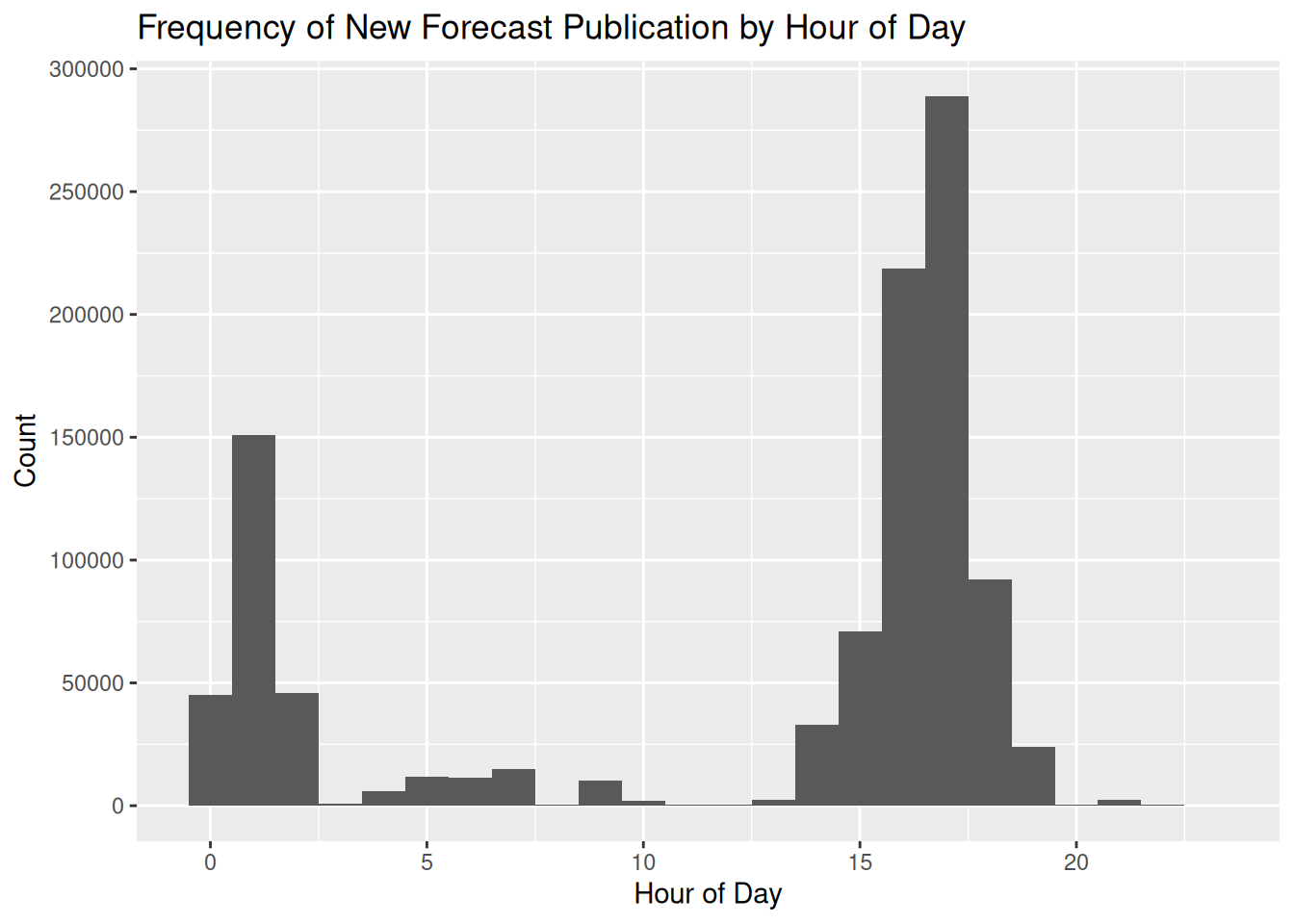 Visualising the forecast data over time becomes messy very quickly, so instead let’s take a look at how often the BOM updates their models. This uses the changed forecast dataset, and is a histogram of the hour in the day in which the changed forecast was published to the website: