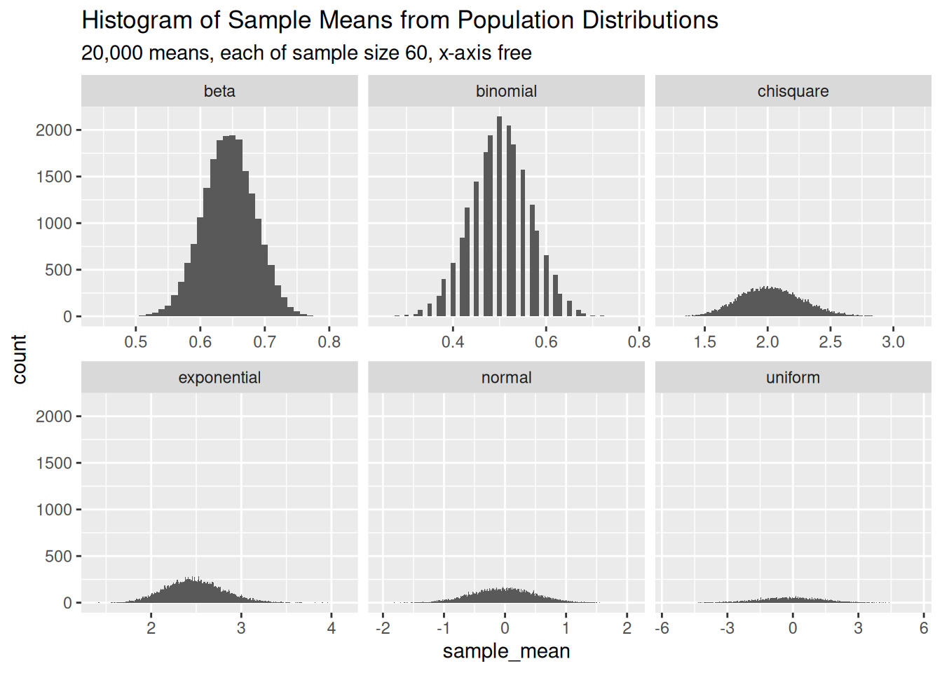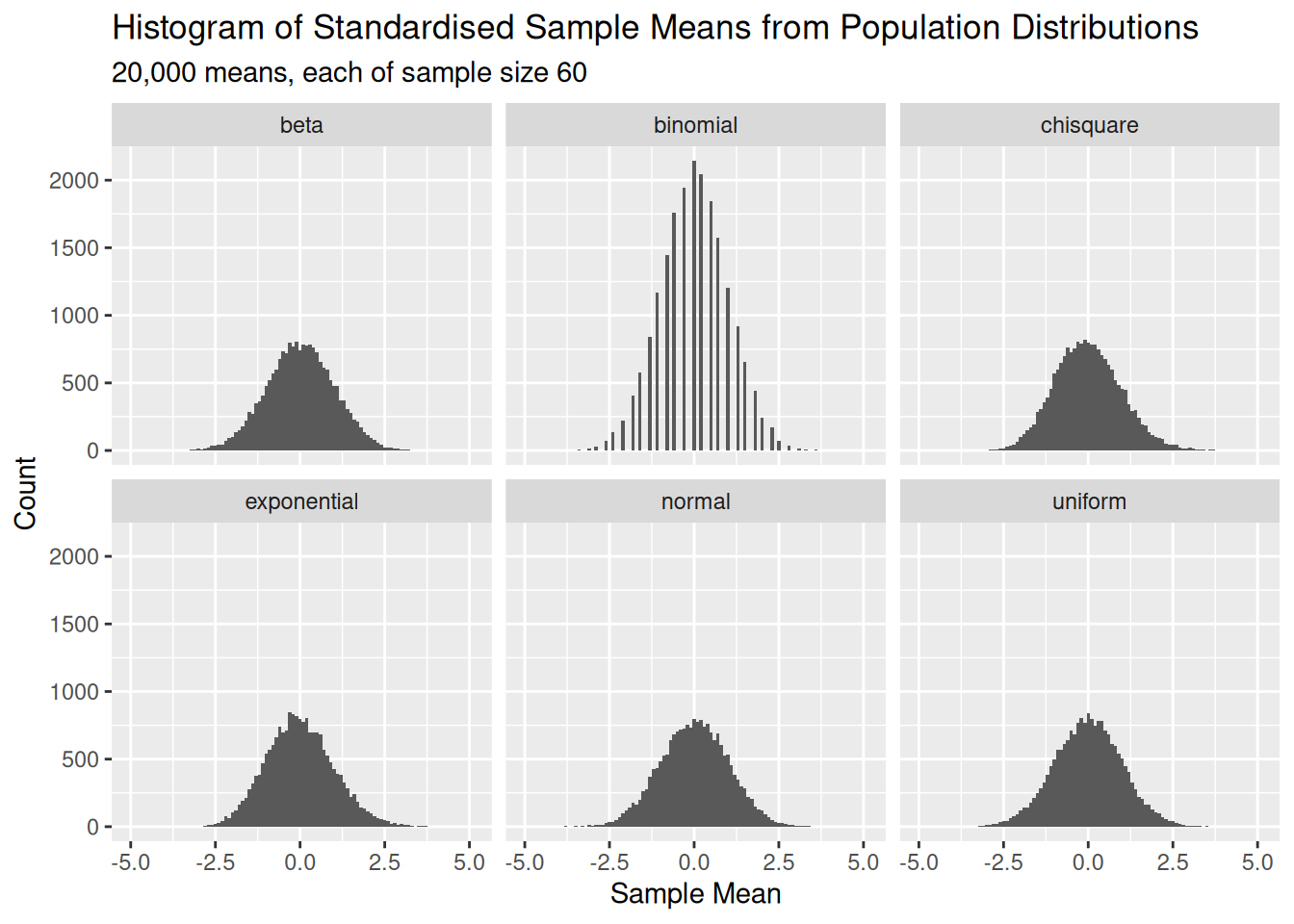Let’s summarise: we took twenty-thousand sample means of size sixty from six wildly different distributions, and we were able to see that the distributions of these sample means approximately followed a normal distribution. This is the essence of the central limit theorem, which allows us to use statistical methods for normal distributions on problems that involve population distributions that aren’t normal.