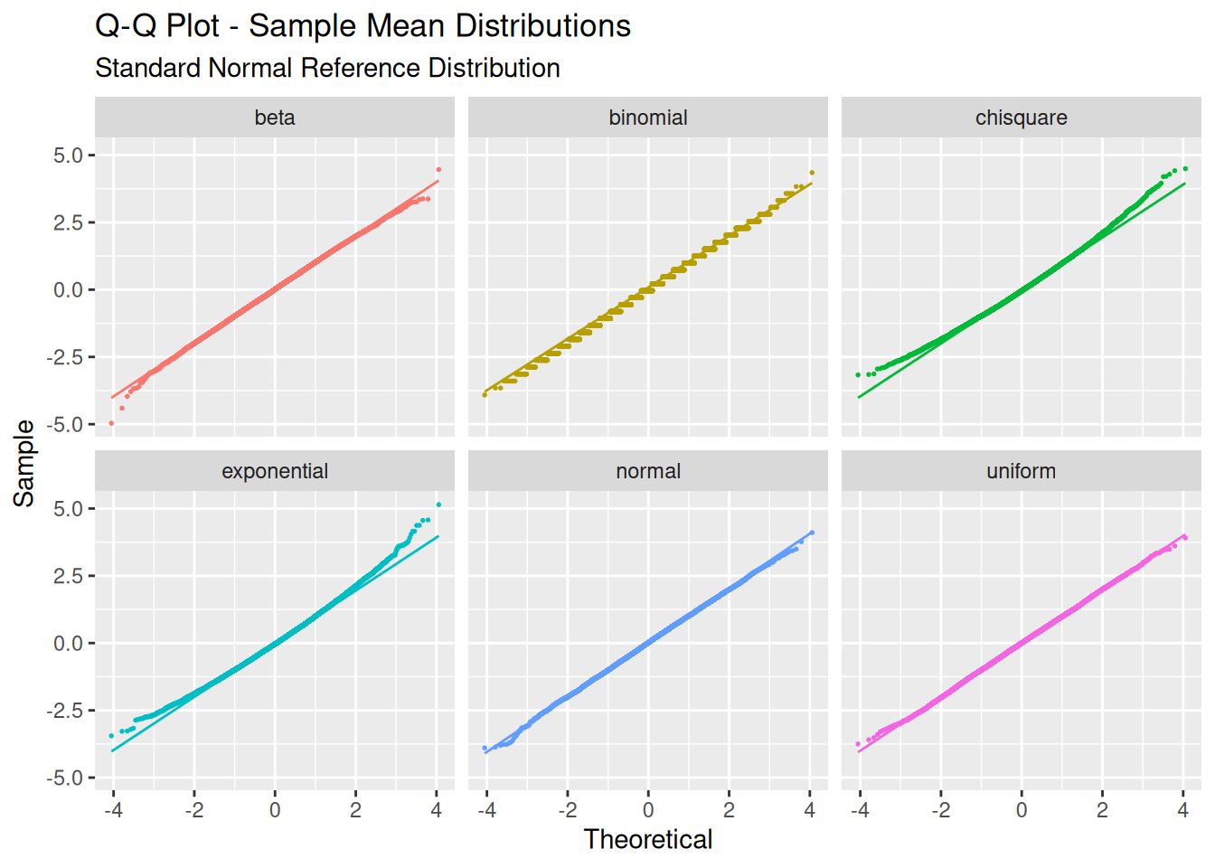 That’s better: they now at least all look the same, except for the binomial which ends up having higher counts because of its discrete rather than continuous values. While you can kind of guess that they’re normal from a histogram, we can get a better sense quantile-quantile plot. The standard normal quantiles are on the x-axis, and our sample mean quantiles are on the y-axis.