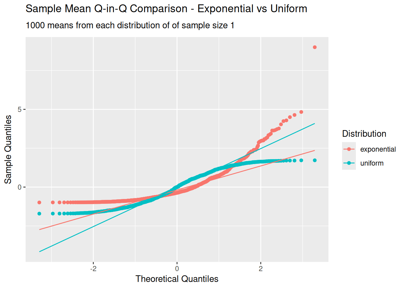 With this data we can create an animation of a Q-Q plot for the uniform versus exponential distributions, showing how the distribution of sample means changes as the sample size increases. You’ll see the distribution approaching the standard normal distribution.