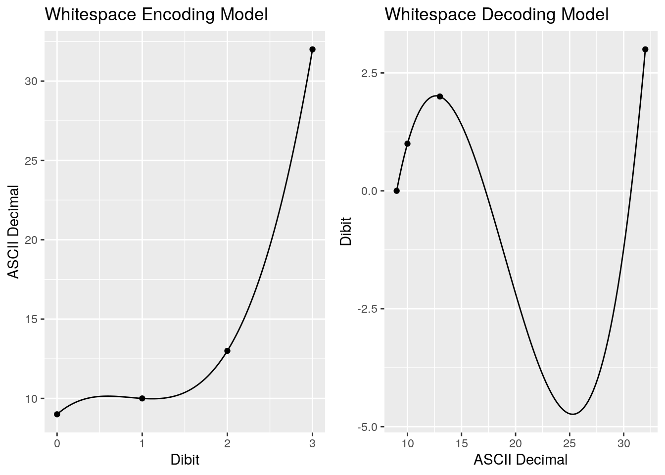 such that when passed a dibit value it returns the appropriate whitespace character. We can also find the inverse polynomial \(f^{-1}(x)\) which takes a whitespace character and returns a dibit to be our decoding function. Let’s create linear regression models in R where whitespace is the table holding our dibit and whitespace values: