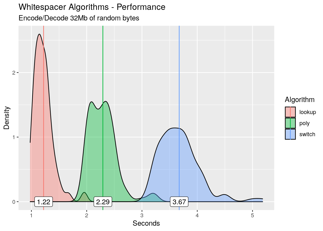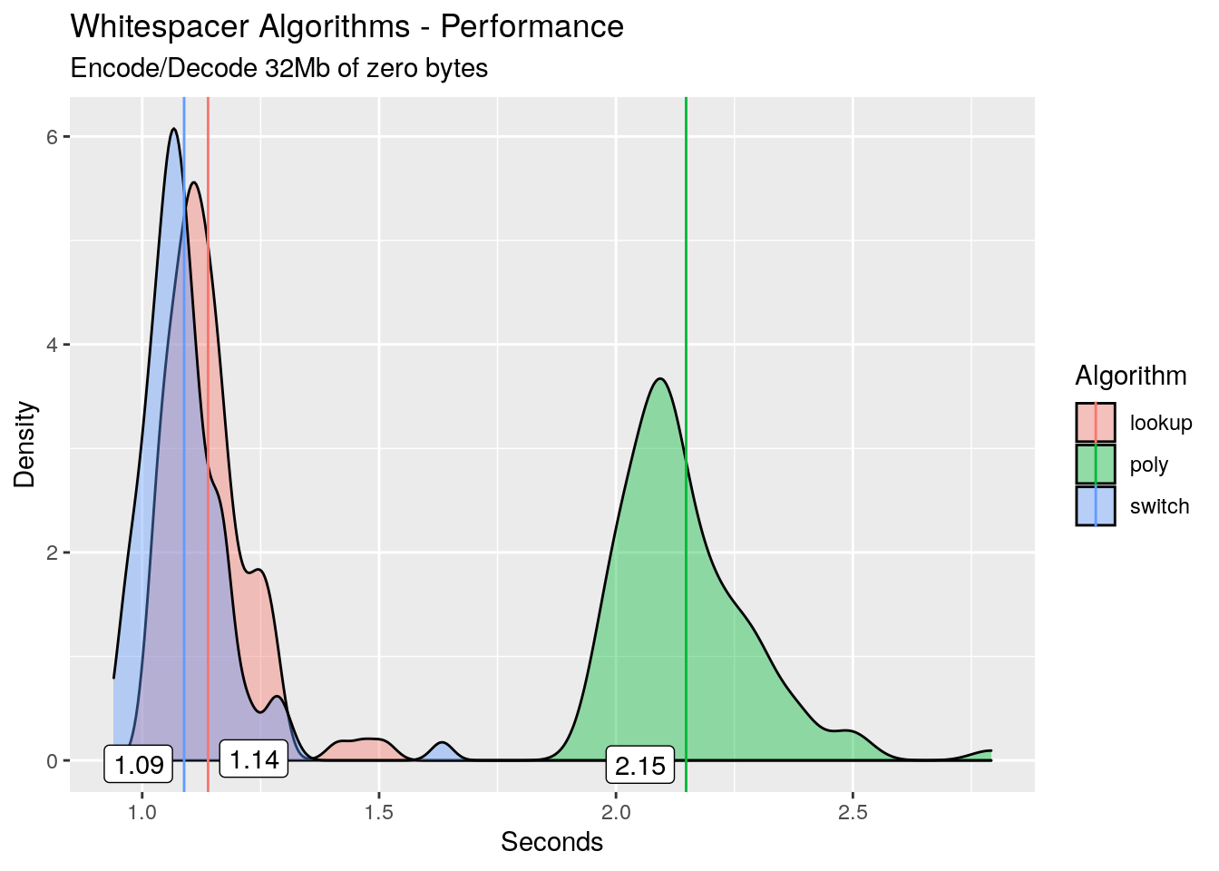 In this article we looked at two different alternatives to a lookup table for encoding and decoding bytes in the whitespacer program. The fist was to try and use a polynomial function, and the second was to use a conditional switch statement.