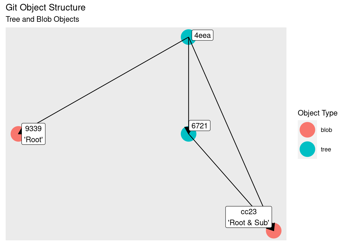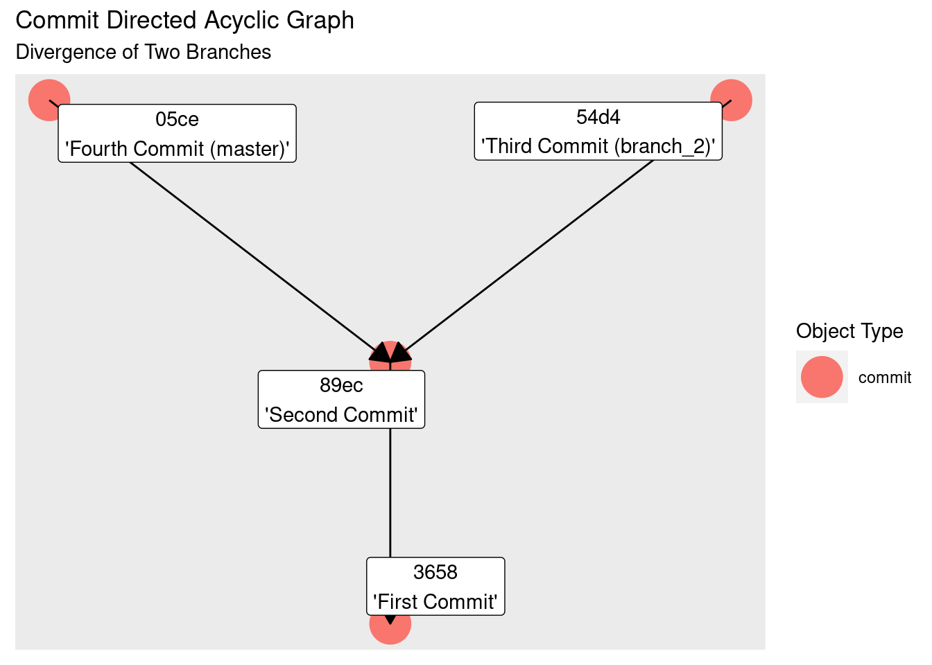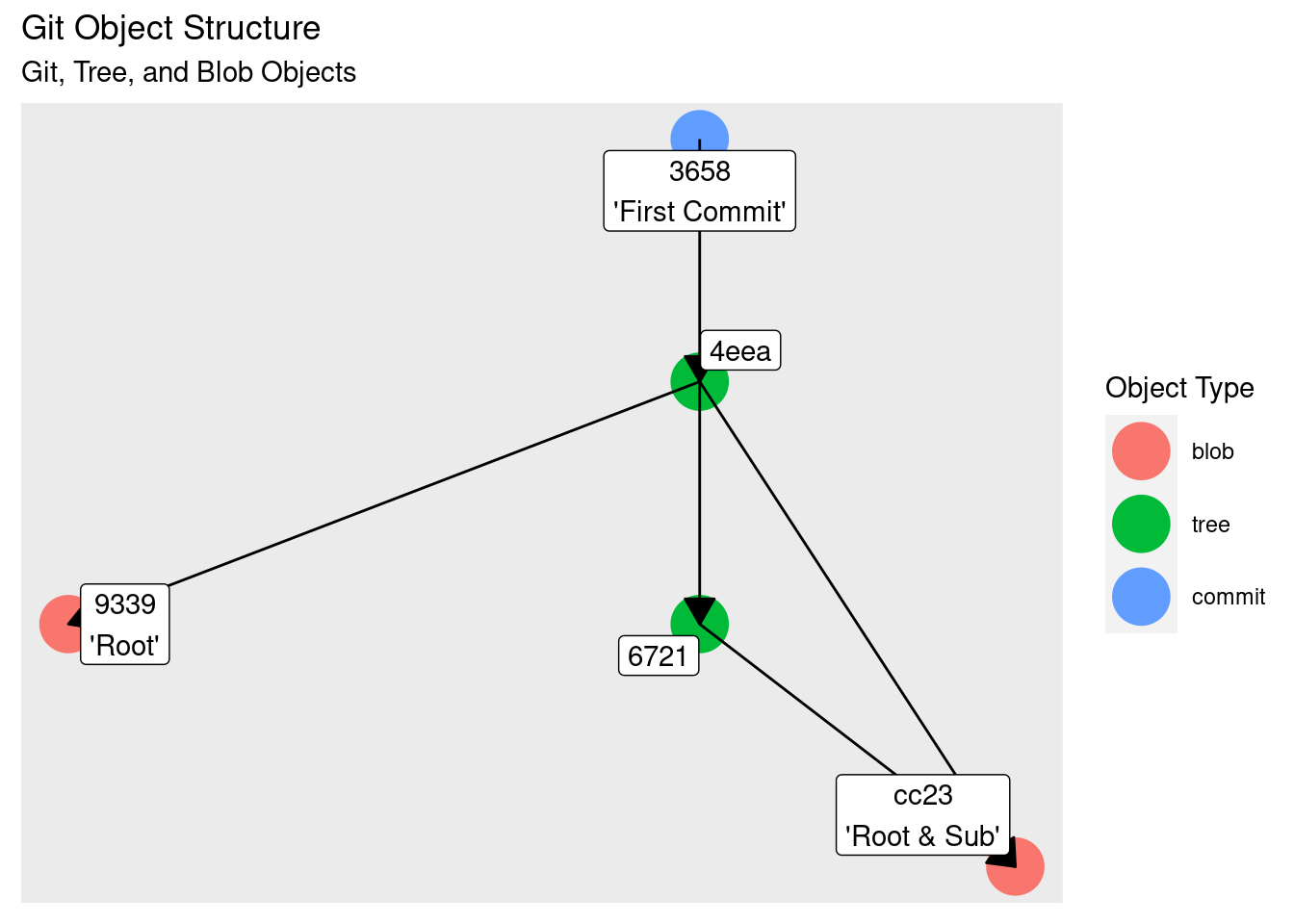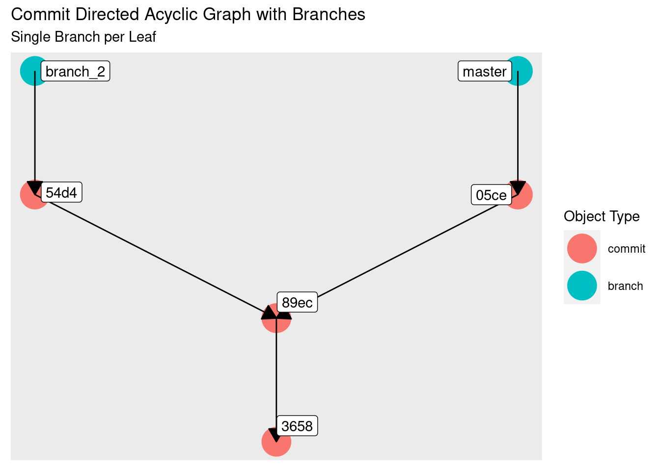 git {init, add, commit, branch, checkout}. All other work will be done using standard command line utilities. - Using the R packages git2r and tidygraph, we’ll dynamically build up a picture of the connections between git’s objects to help understand how they are tied together.