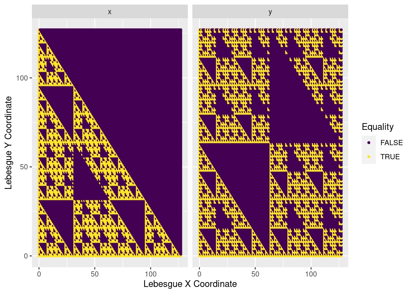 In the C++ code below I’ve defined the lebesgue_coords() function that implements the above algorithm. It’s certainly not the most optimal implementation (it iterates through all the bits even if they’re 0), but it should have clarity. I’ve then vectorised it in the lebesgue() function that returns a list of \(x\) and \(y\) coordinates for each \(z\) integer, and exported using Rcpp so it can be used in the R environment: