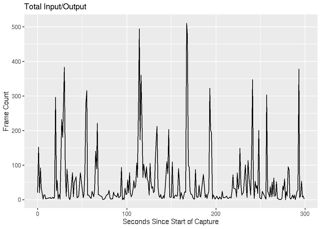 This is the default graph you would find by going to [Statistics -> I/O Graph] in Wireshark. We round the each frame’s time to the nearest second and tally up the number of frames occurring within each of these seconds.