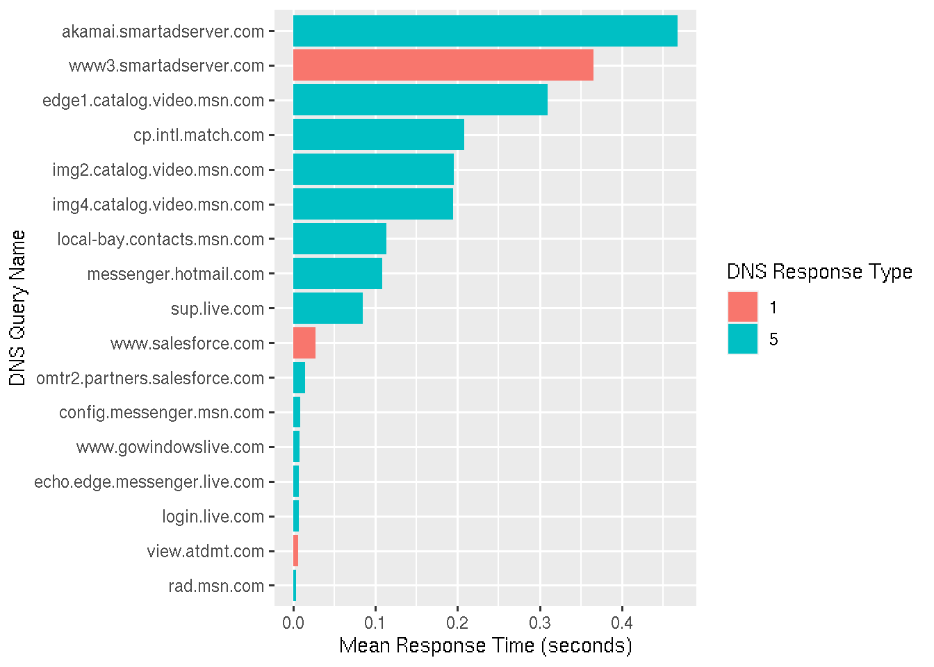 Finally, let’s take a look at DNS response times. We filter for DNS responses, group by the query and the response type, calculate the mean response time for each of these groups an plot it.