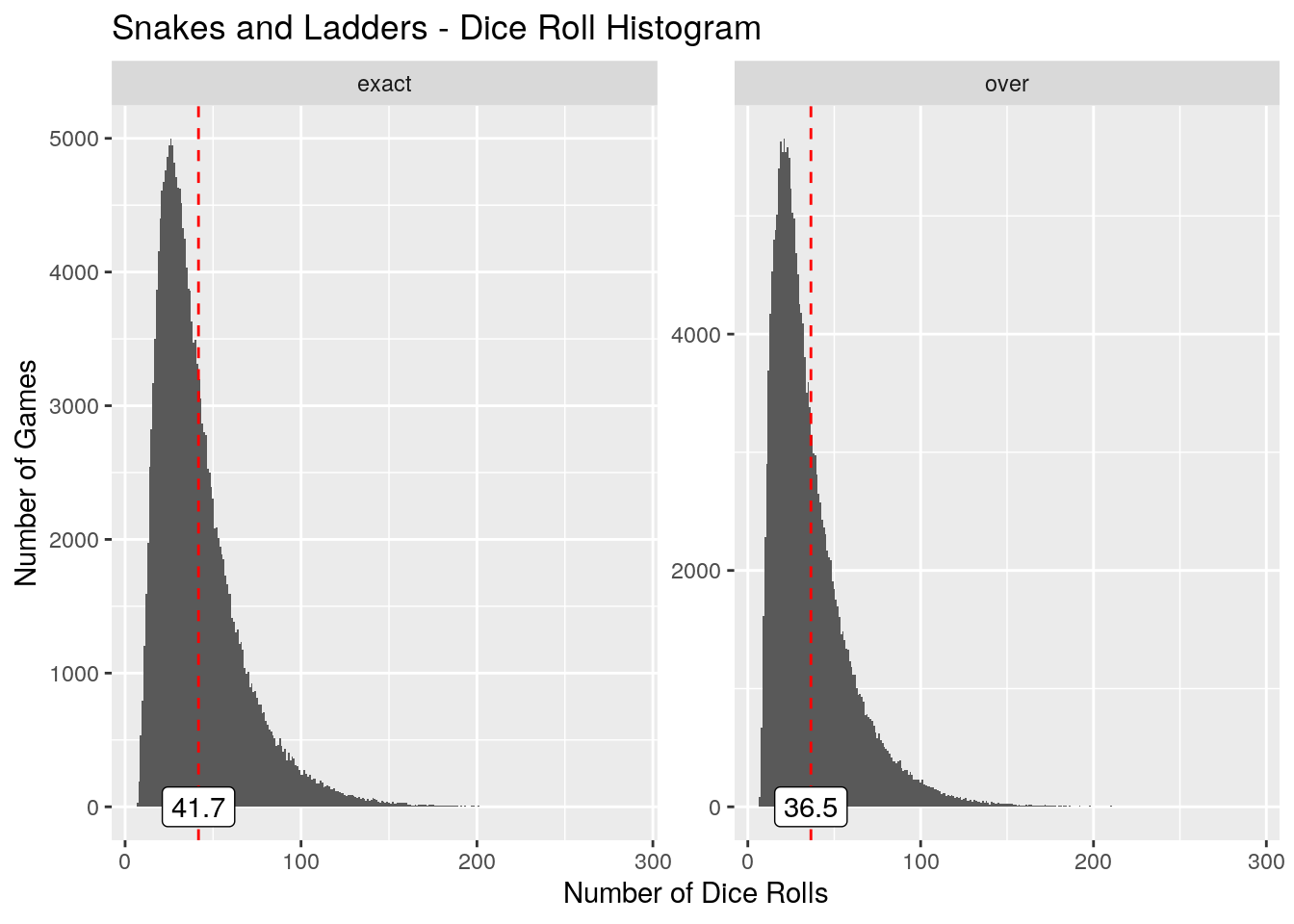 Now that we’ve defined a data structure and an algorithm, let’s try and determine the average number of rolls to win on my son’s board. Using my new favourite function crossing(), 200,000 games are simulated for each of the finish types and summary statistics calculated. We visualise the distribution of the numbner of rolls as a histogram: