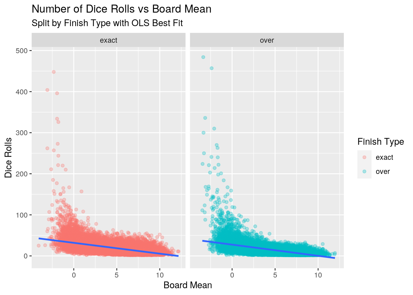 The coefficient of the board mean variable is very similar for both finish types, -2.6 and -2.7 for the exact and over types respectively. This tells us that for every one unit increase in the board mean, the number of rolls to finish a game on average decreases by -2.6 and -2.7 rolls.