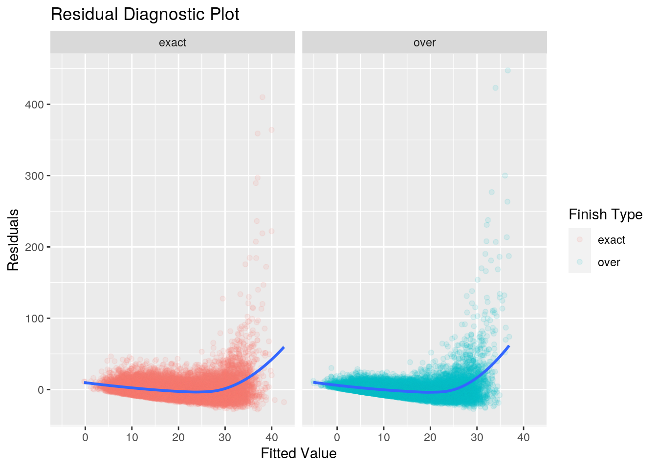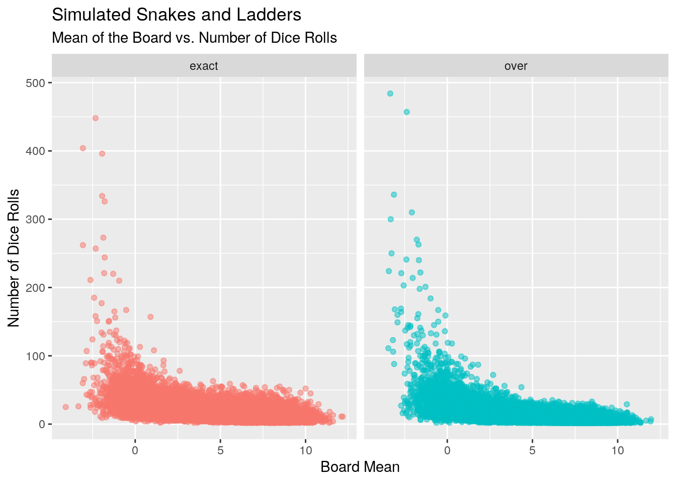 How well does the least squares model the number of roles in terms of the mean of the board? The R-squared value tells us that the linear regression explains around 25% for the exact finish type, and 28% for the over finish type. On first glance that seems low, however it’s probably reasonable given the randomness of the dice rolls and the snakes and ladders.